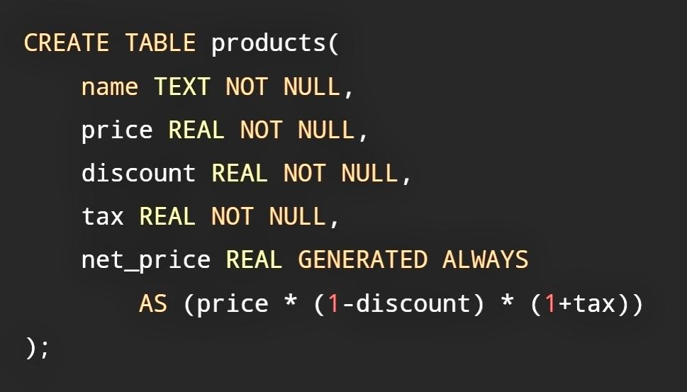 column_name data_type [GENERATED ALWAYS] AS expression [VIRTUAL | STORED]