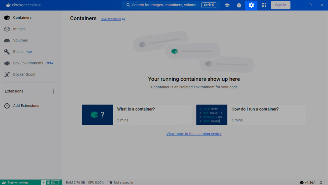 Для початку відкрий Docker Desktop та натисни на іконку налаштувань.