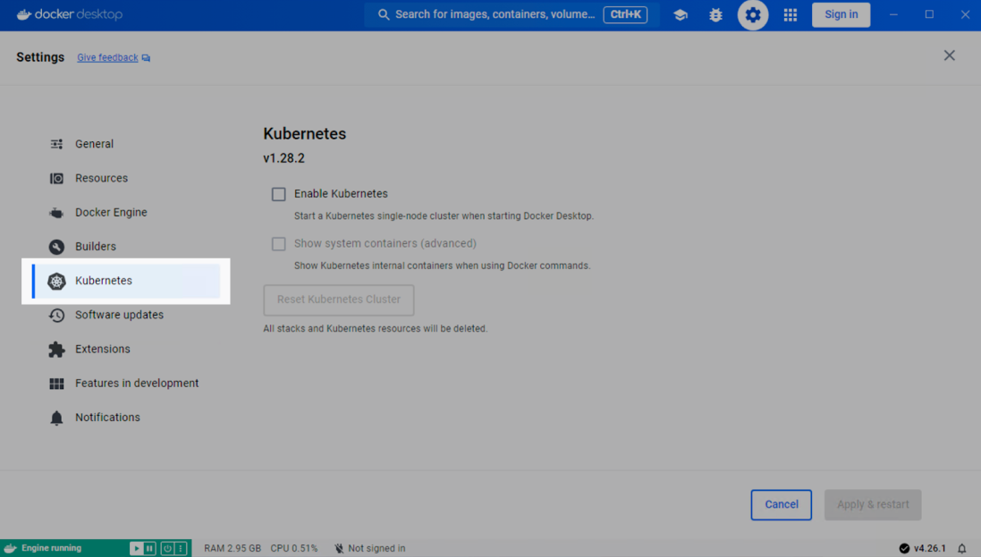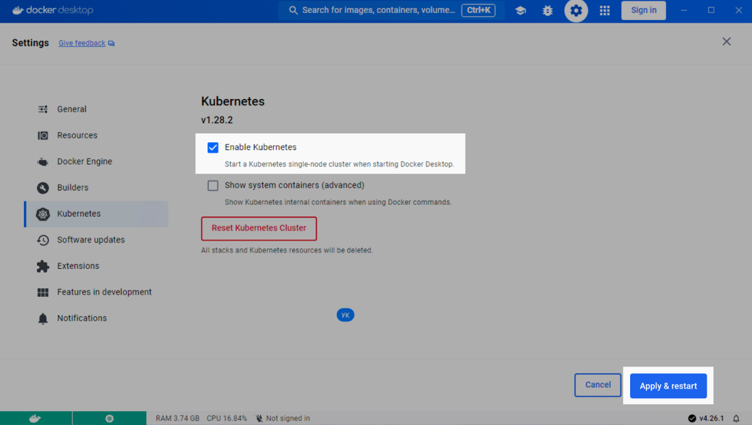 Обери опцію Enable Kubernetes та натисни кнопку Apply & restart.