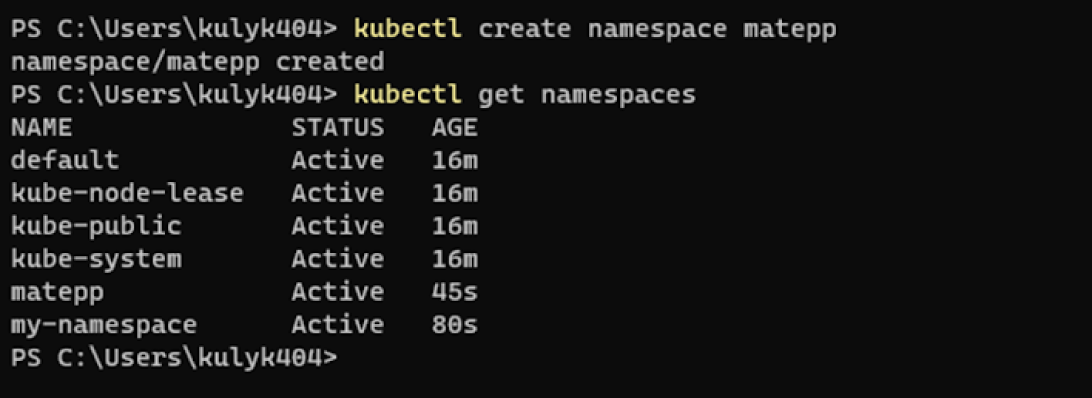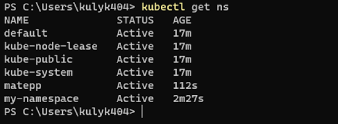 Подів немає у просторі за замовчуванням (неймспейсі). Неймспейс (від англ. namespace) — це спосіб ізоляції подів. Ми можемо створювати ці неймспейси і вказувати їх для конкретних подів. Створити новий неймспейс можна за допомогою наступної команди: