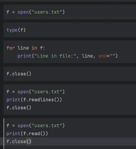 r— reads the file and returns an error if the file does not exist;w— writes data to a file and creates a new file if it does not exist or overwrites the existing file;a— appends data to a file, and creates the file if it does not exist, or adds new information at the end of the existing file;x— writes data to a file and returns an error if the file already exists (exclusive creation);t— is used only for textual files (text mode — we see the text);b— is used for non-textual files, such as images, videos, etc. (binary mode — we see0and1);+— allows to work in the read and write modes simultaneously.