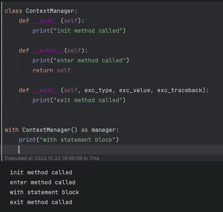 __init__or__enter__, then the code block is never executed and the__exit__is not called. - After entering into a block of code, the